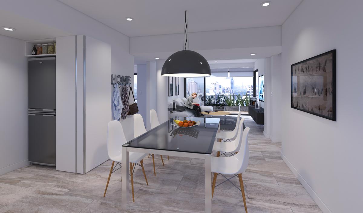 Amplio estar con cocina integrada con amoblamiento completo y orientación doble, balcón terraza con parrilla a gas, dormitorios principal en suite con vestidor doble, segundo dormitorio con placard, baño completo-.