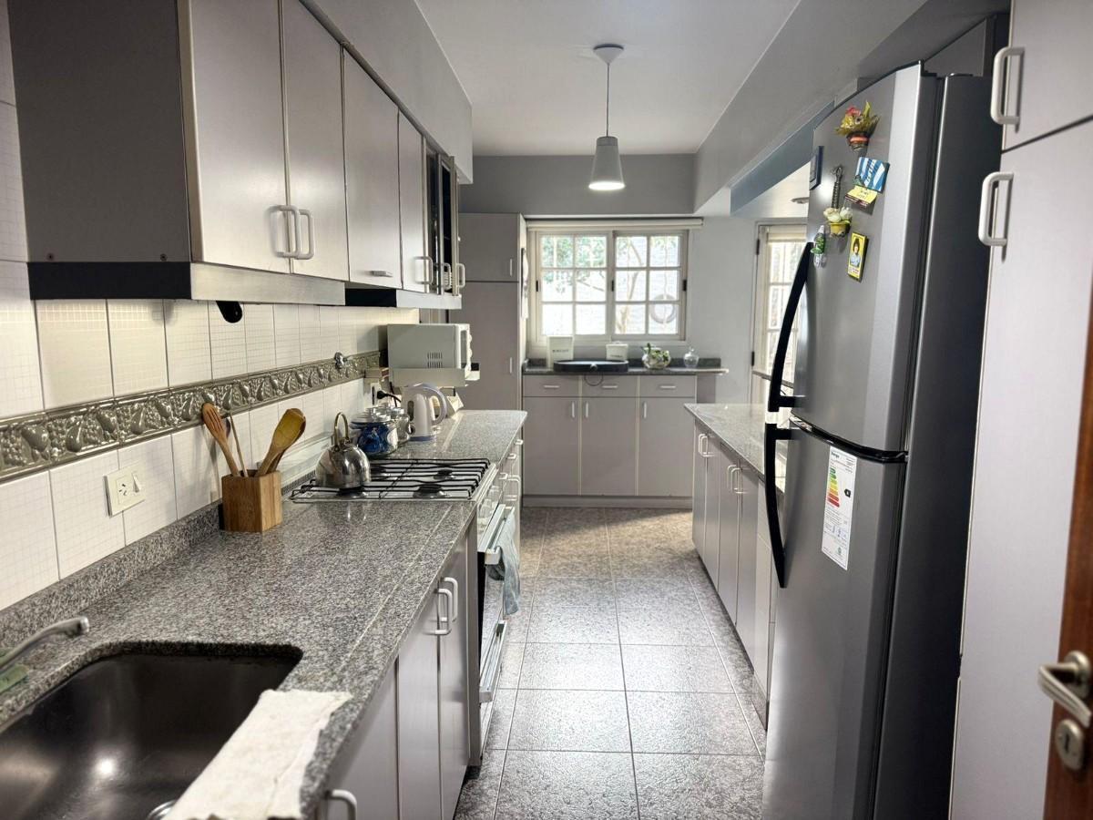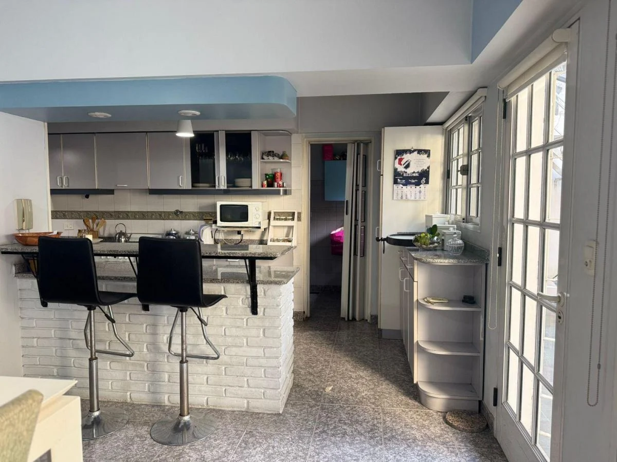 Cocina comedor integrada con barra desayunadora y salida directa al patio.