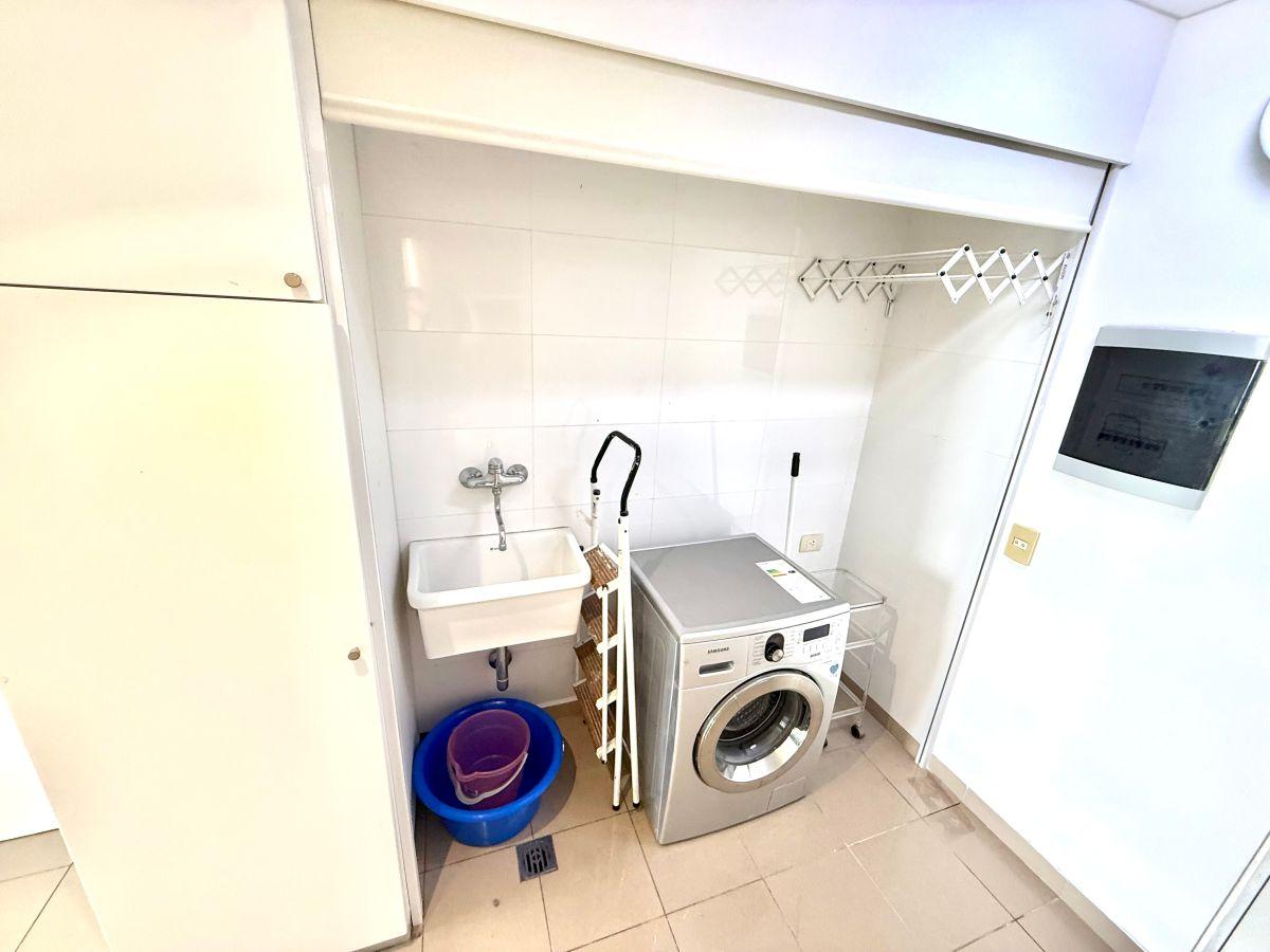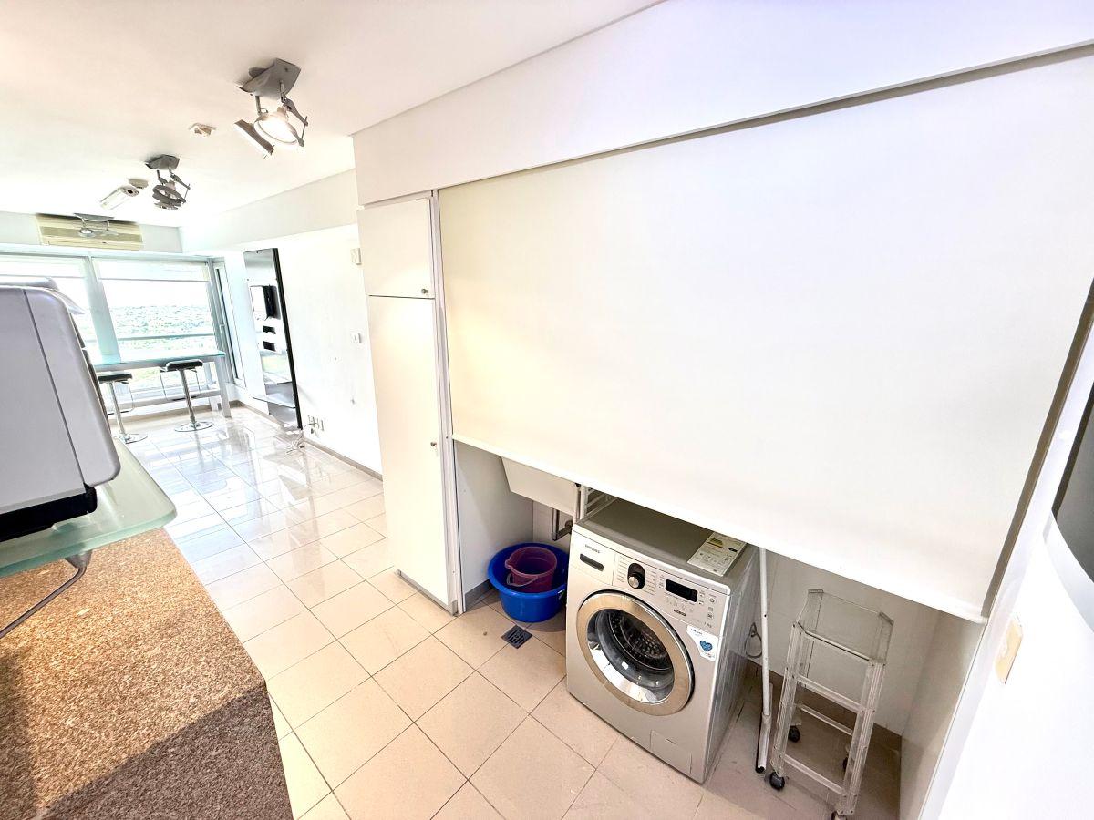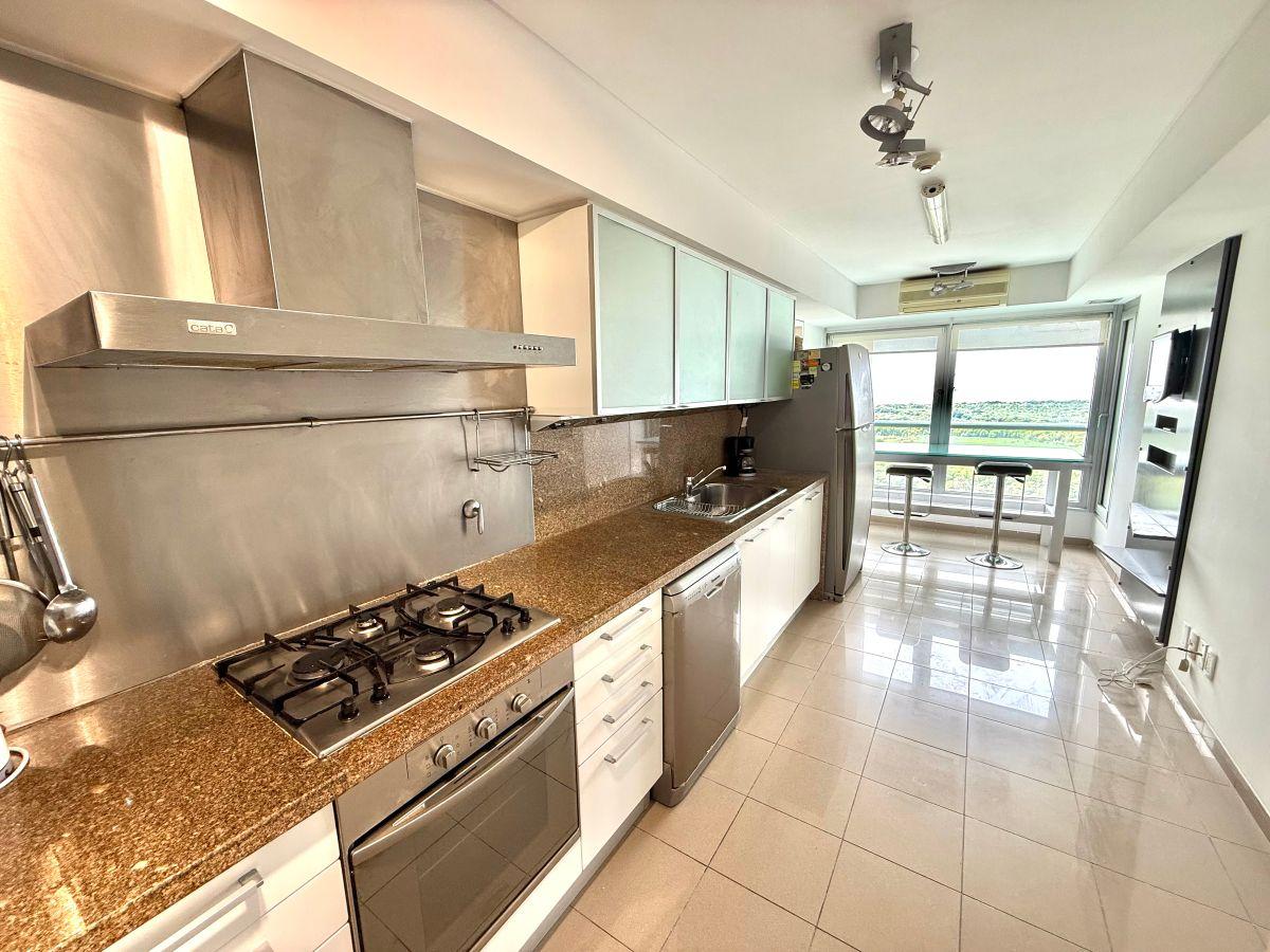 El diseño del departamento permite una fluida circulación hacia los dormitorios y la cocina. La cocina es espaciosa y funcional, equipada con una práctica barra desayunadora donde podrás disfrutar de tu desayuno con vistas a la laguna. Además, cuenta con entrada de servicio, muebles sobre y bajo mesada, y un área de lavadero que se puede ocultar con una cortina automática.