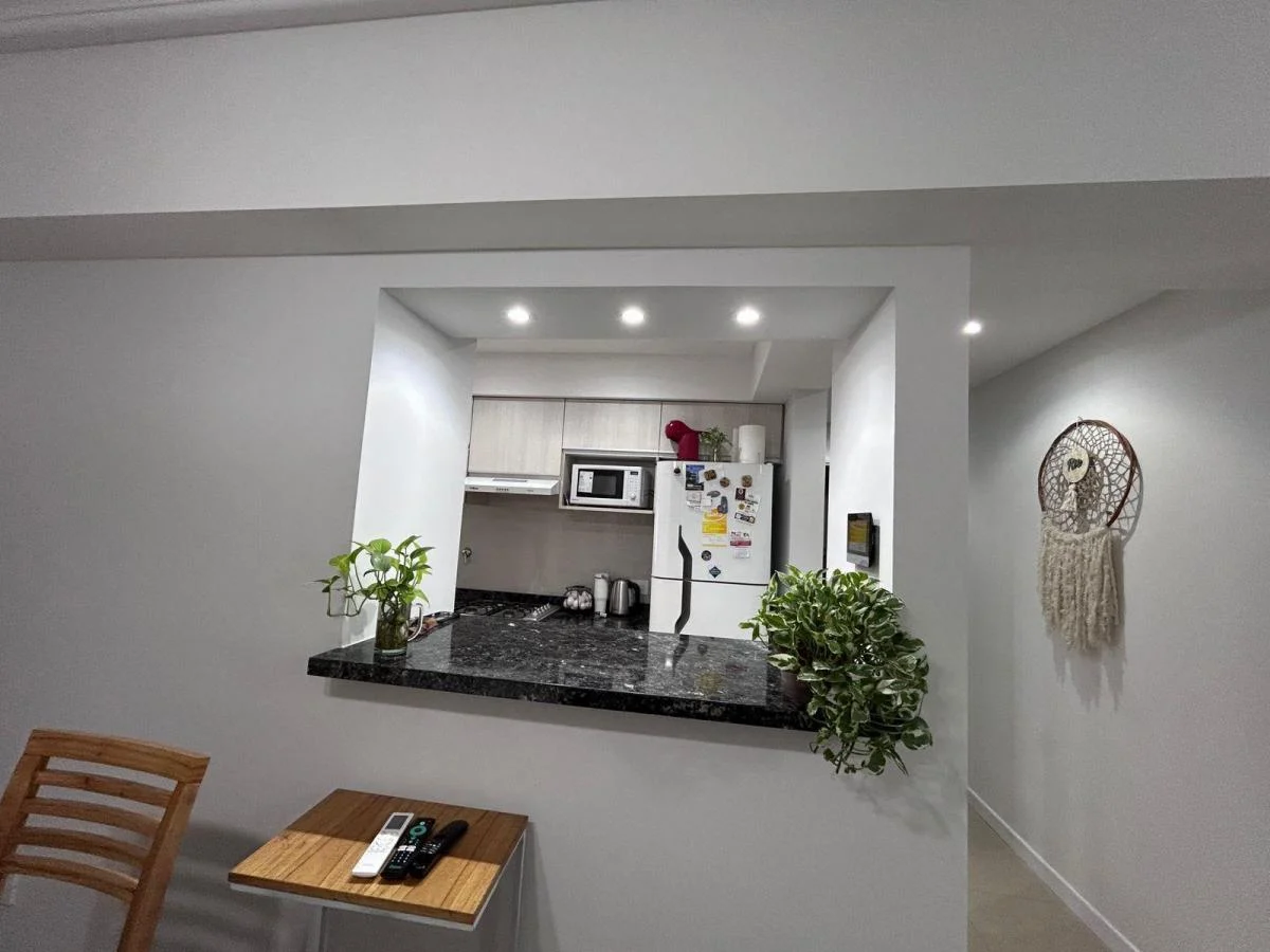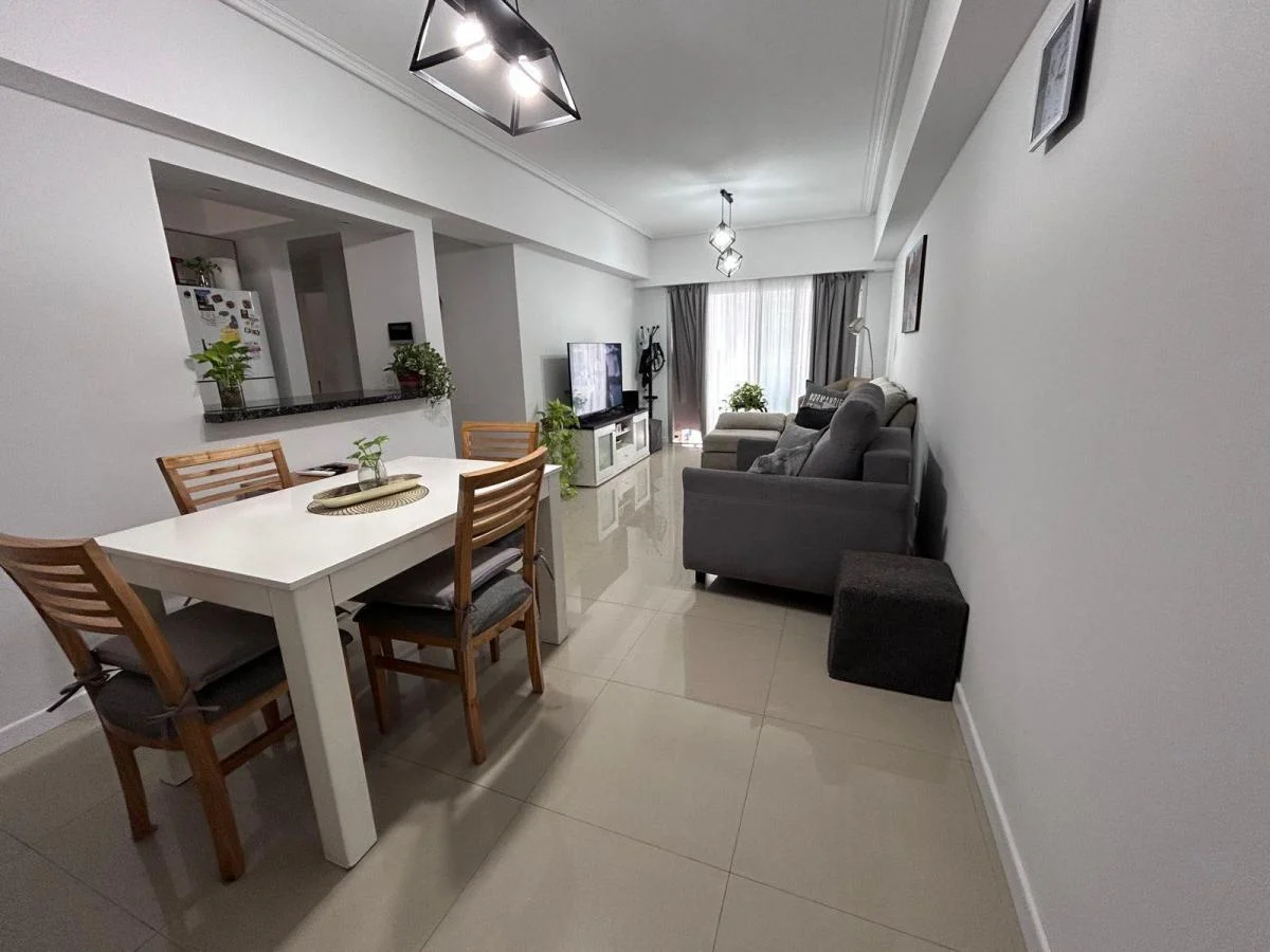 Al ingresar, nos recibe un amplio y luminoso living comedor, con salida a balcón y orientación retirada de la calle, lo que asegura tranquilidad y privacidad. La cocina se integra de manera funcional mediante una moderna barra desayunadora con espacios de guardado, generando un ambiente práctico y canchero a la vez.