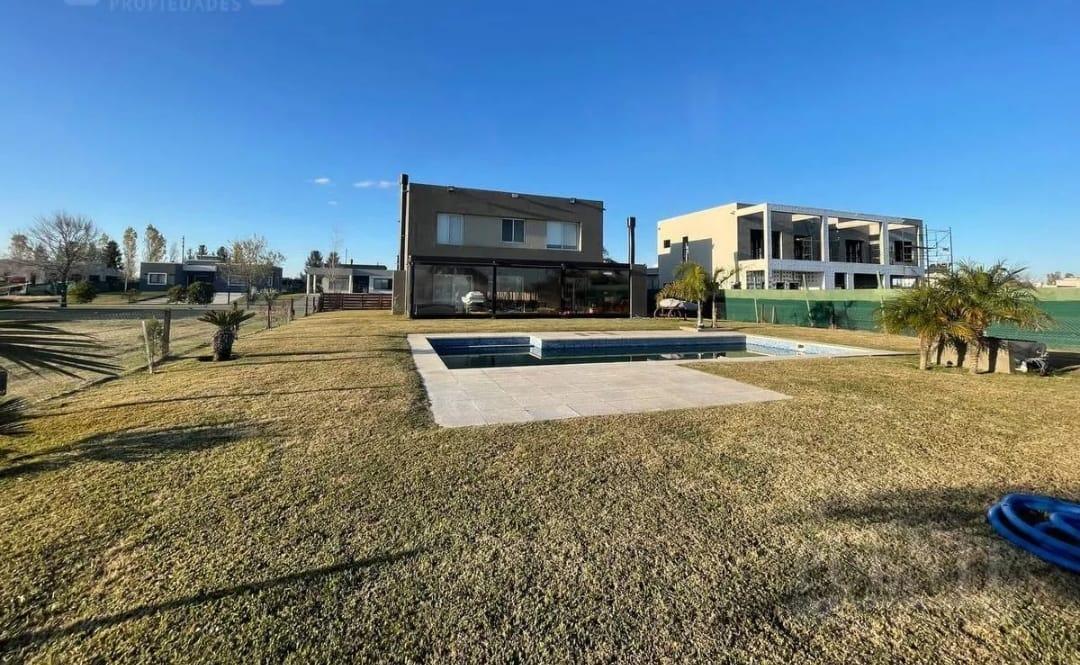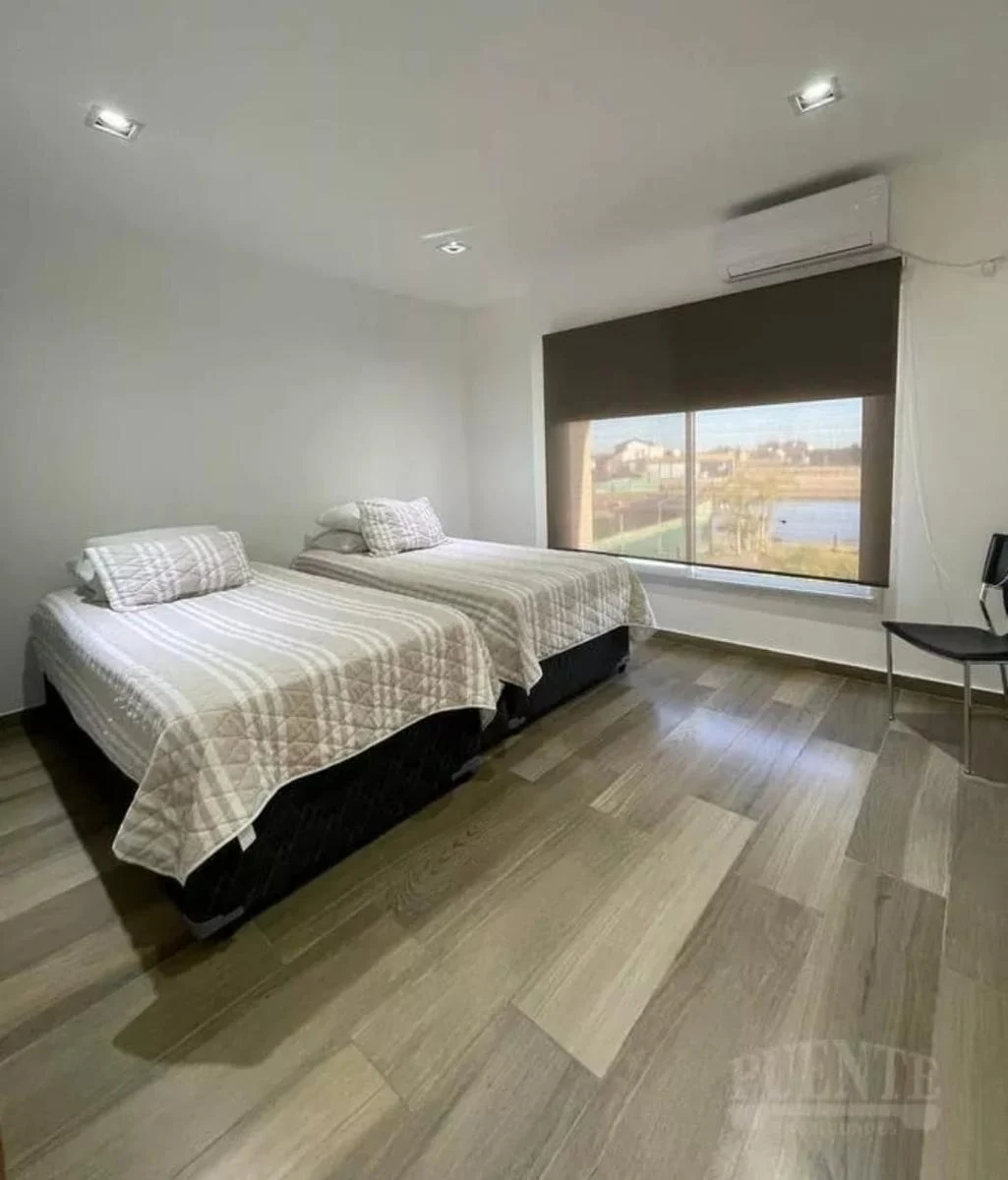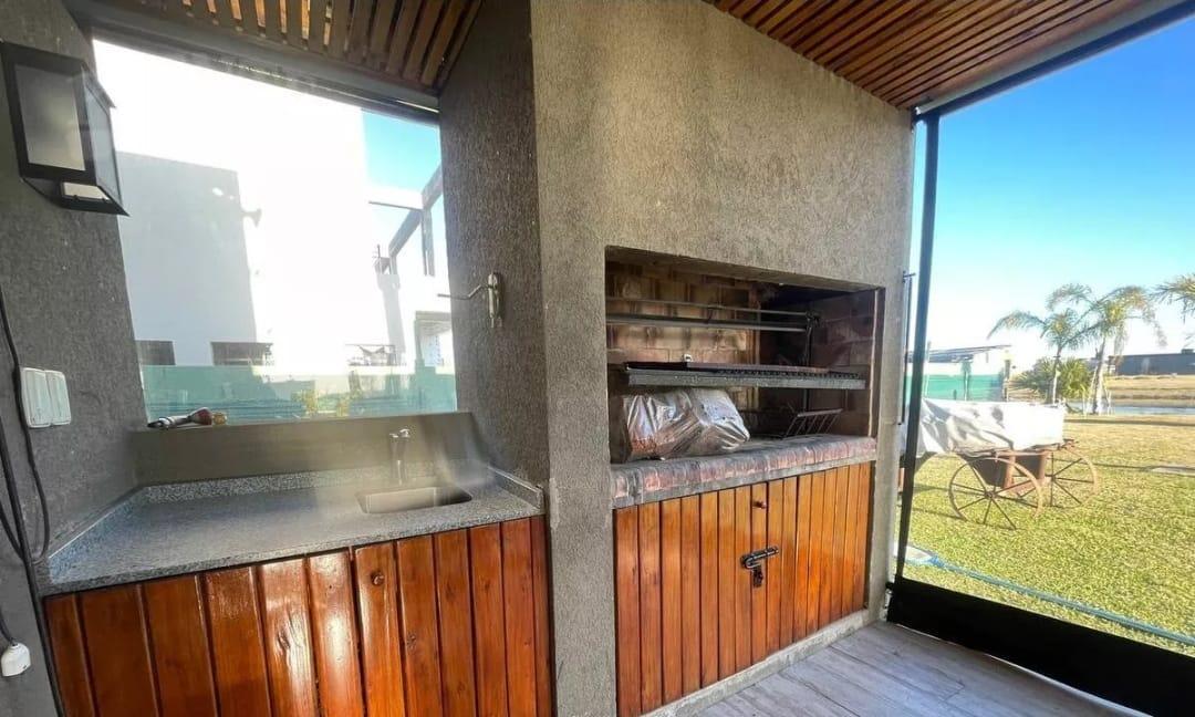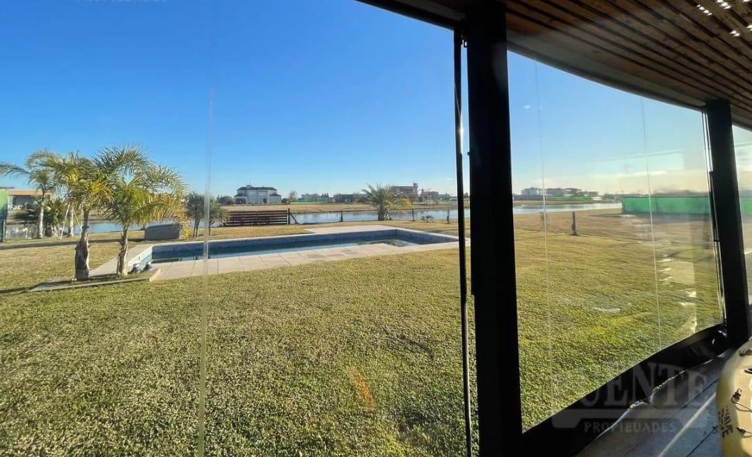 En el exterior, ofrece una amplia galería con parrilla, equipada con cerramientos desmontables que permiten su uso durante todo el año. El jardín es amplio, con pileta de material equipada con bomba y accesorios Vulcano, y una destacada vista al lago, siendo actualmente una de las pocas unidades en venta con esta característica dentro del barrio.