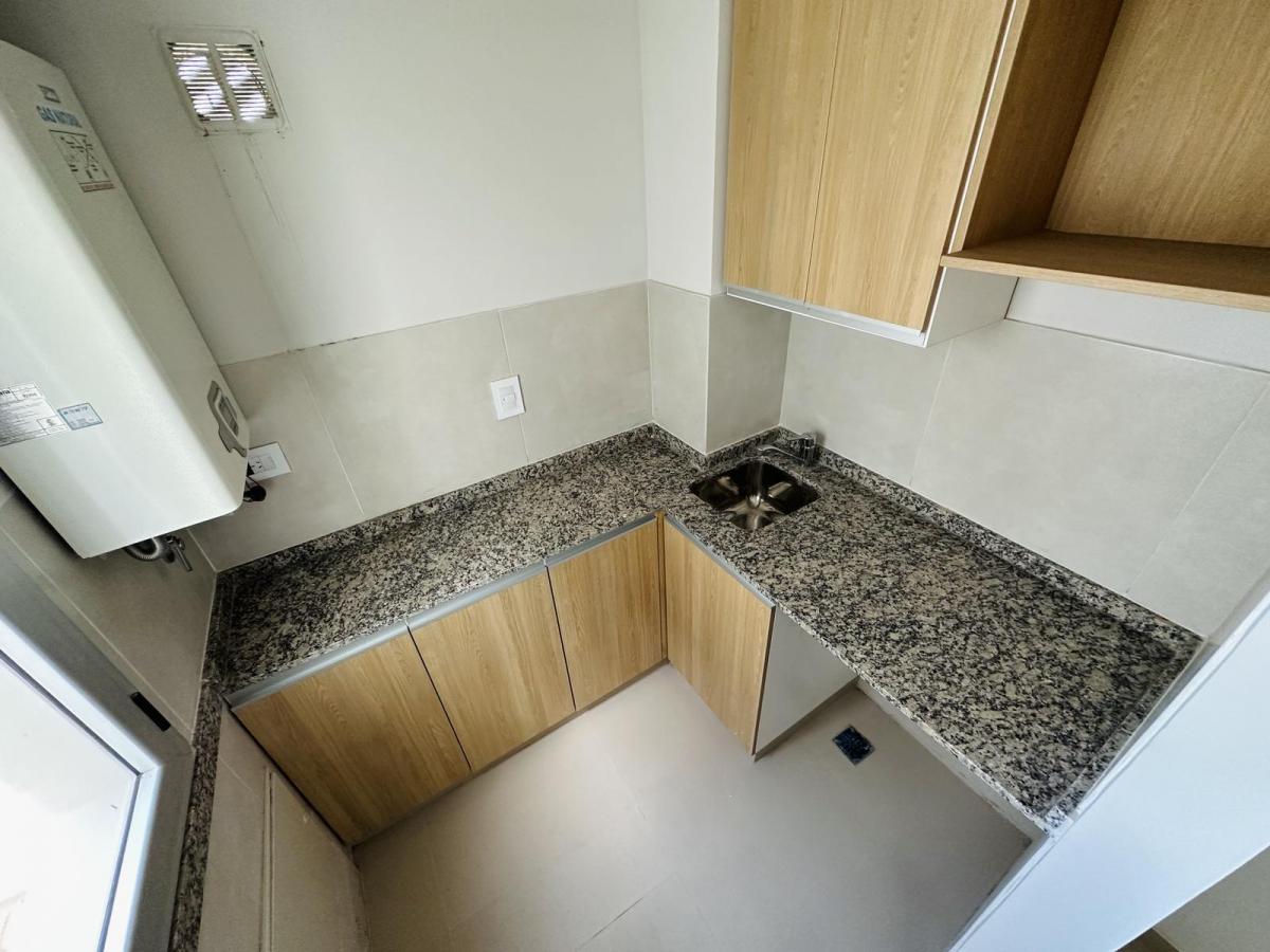 Al ingresar, nos encontramos con un living comedor con piso de porcelanato, cielorraso en yeso y molduras decorativas, con salida al frente del edificio a balcón corrido. Desde este living-comedor, es posible acceder a un toilette de invitados. Luego, hacia el pasillo distribuidor podemos acceder a una cocina con piso de porcelanato, muebles de cocina en melamina con bordes de aluminio, grifería fv monocomando, mesada de mármol con bacha de acero inoxidable. El lavadero se encuentra hacia un costado de la cocina y cuenta con la misma calidad de materiales. El baño completo cuenta con piso y paredes en porcelanato, artefactos sanitarios marca ferrum, grifería fv y bañera acrílica. Los dormitorios cuentan con piso flotante, placard con puerta corrediza y cielorraso en yeso con molduras decorativas.